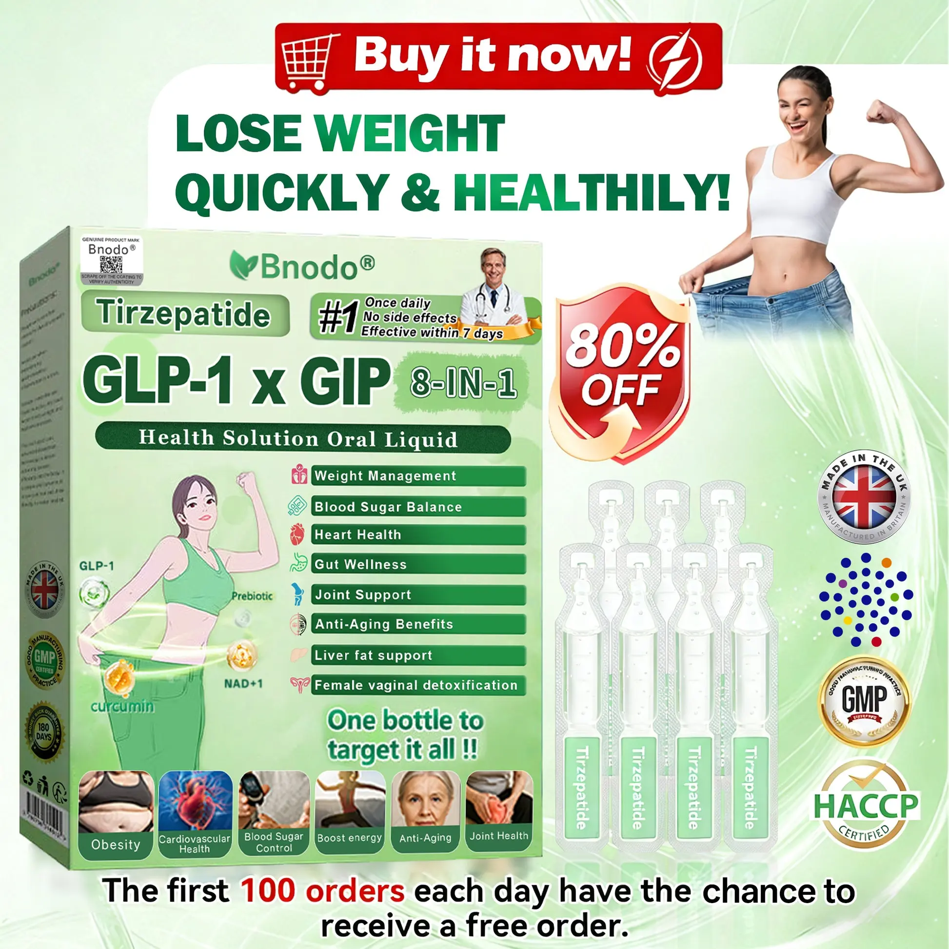 Bnodo® Tirzepatide GLP-1 × GIP 8-in-1 Health Solution Oral Liquid, developed through over 20 years of research by more than 30 experts, is suitable for all adults and body types. This formula combines Tirzepatide (GLP-1 + GIP) with natural extracts to help regulate blood sugar, control appetite, and burn fat for steady, healthy weight loss. Enhanced with Collagen Peptides, it also supports skin firmness while slimming, and delivers a range of powerful ingredients that improve immunity, support digestion, promote gut and women’s health, boost energy, reduce fatigue, and restore youthful vitality. Manufactured in MHRA-certified facilities in compliance with UK standards, it offers a safe, science-backed, needle-free solution for effective weight management and long-term health.