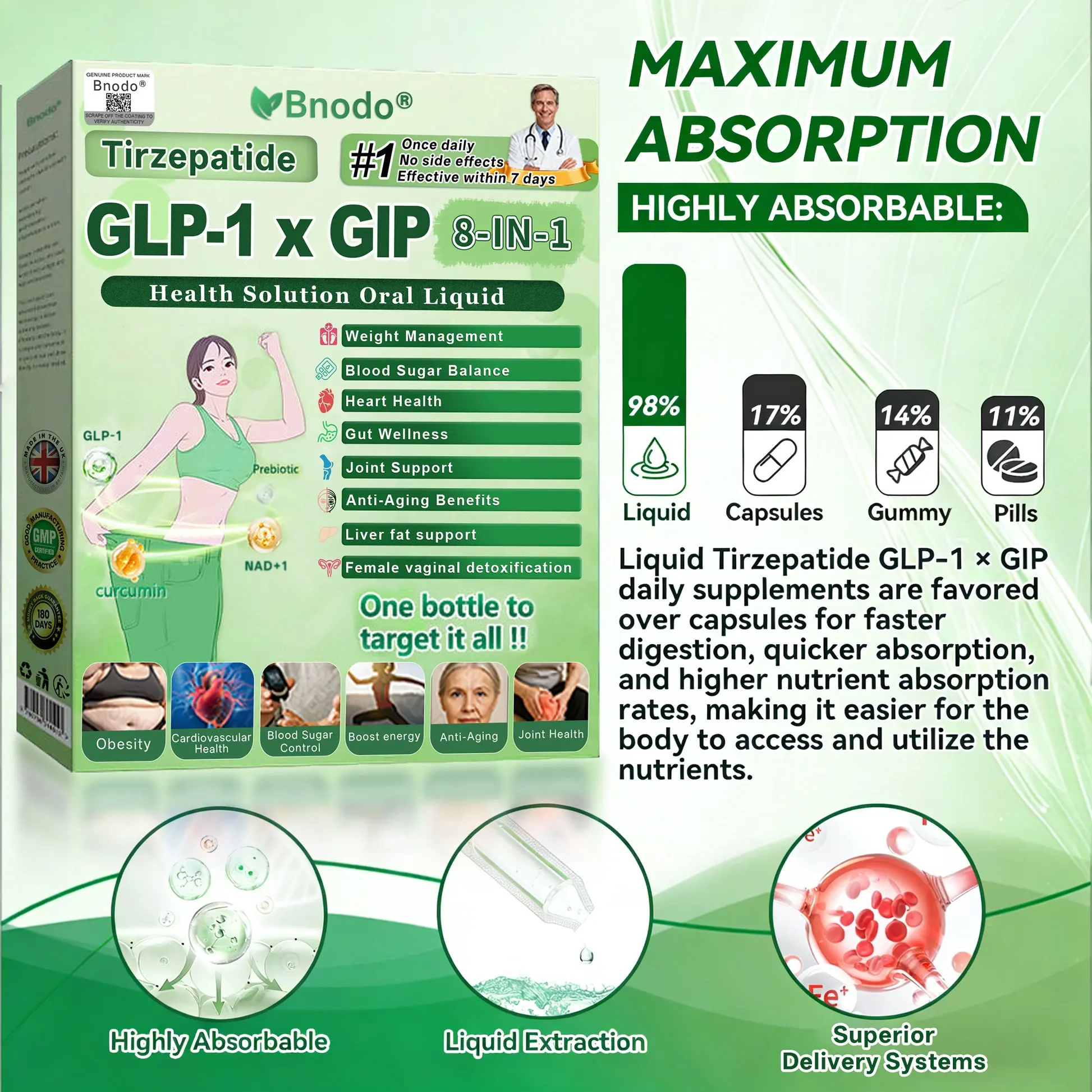 Bnodo® Tirzepatide GLP-1 × GIP 8-in-1 Health Solution Oral Liquid: 98% Absorption Rate: Transforming Weight, Liver, Gut & Skin Health
